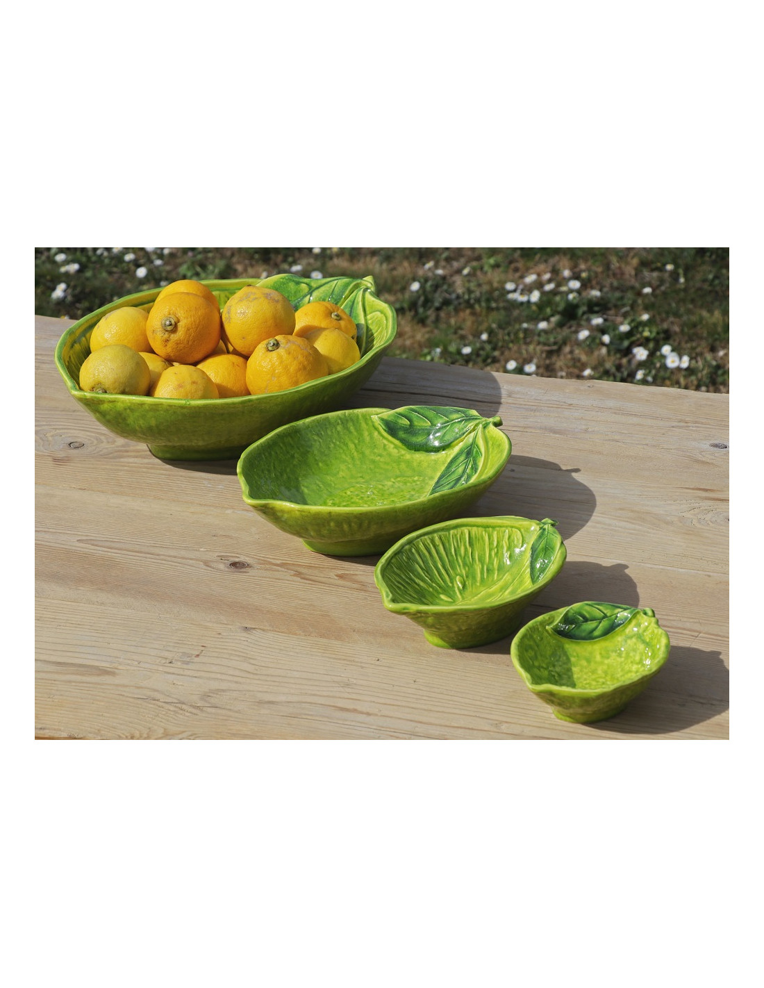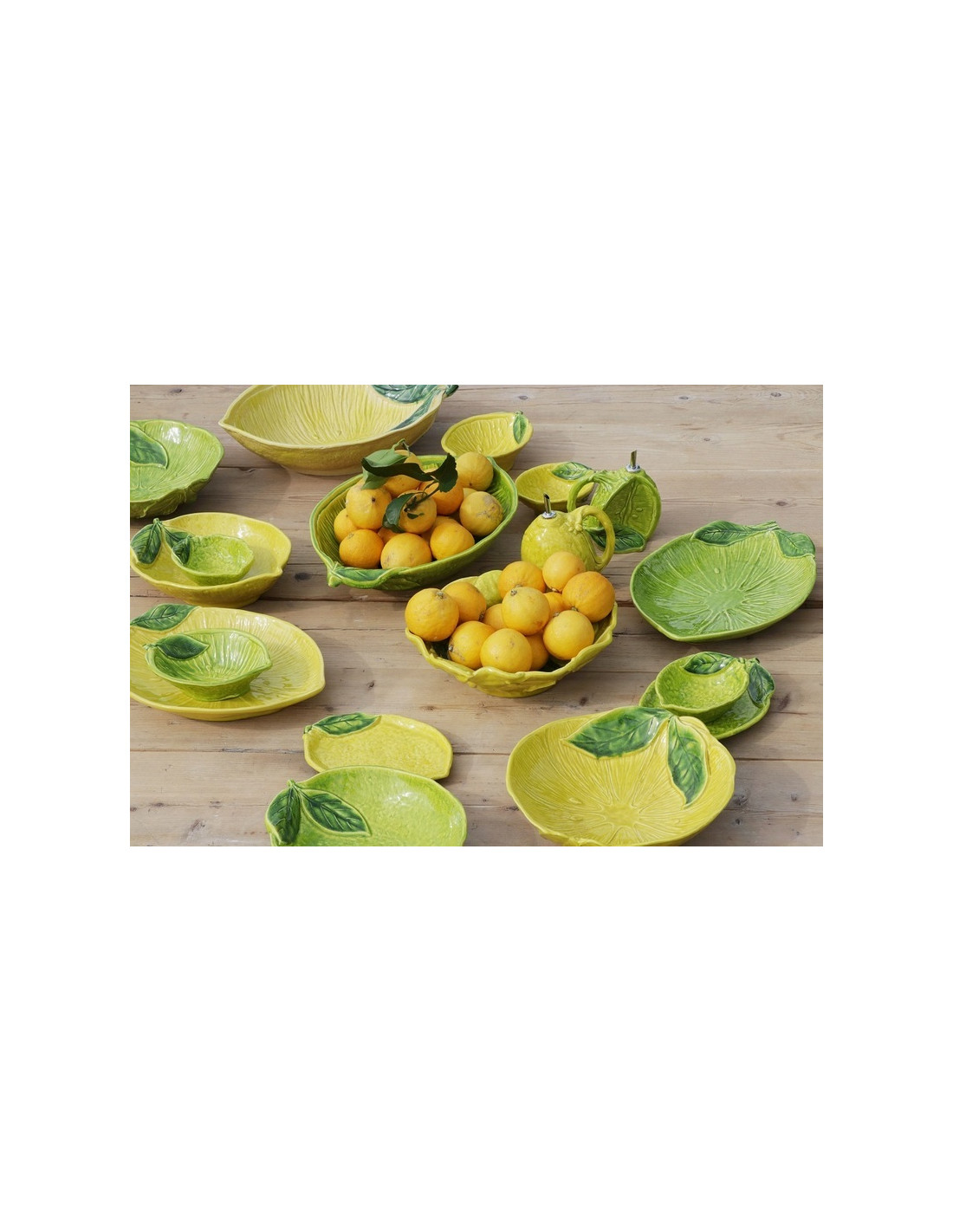 Gli agrumi vengono abbinati alle forme ceramiche per la nostra tavola con naturalezza e fantasia nei color verde, giallo e bianco.