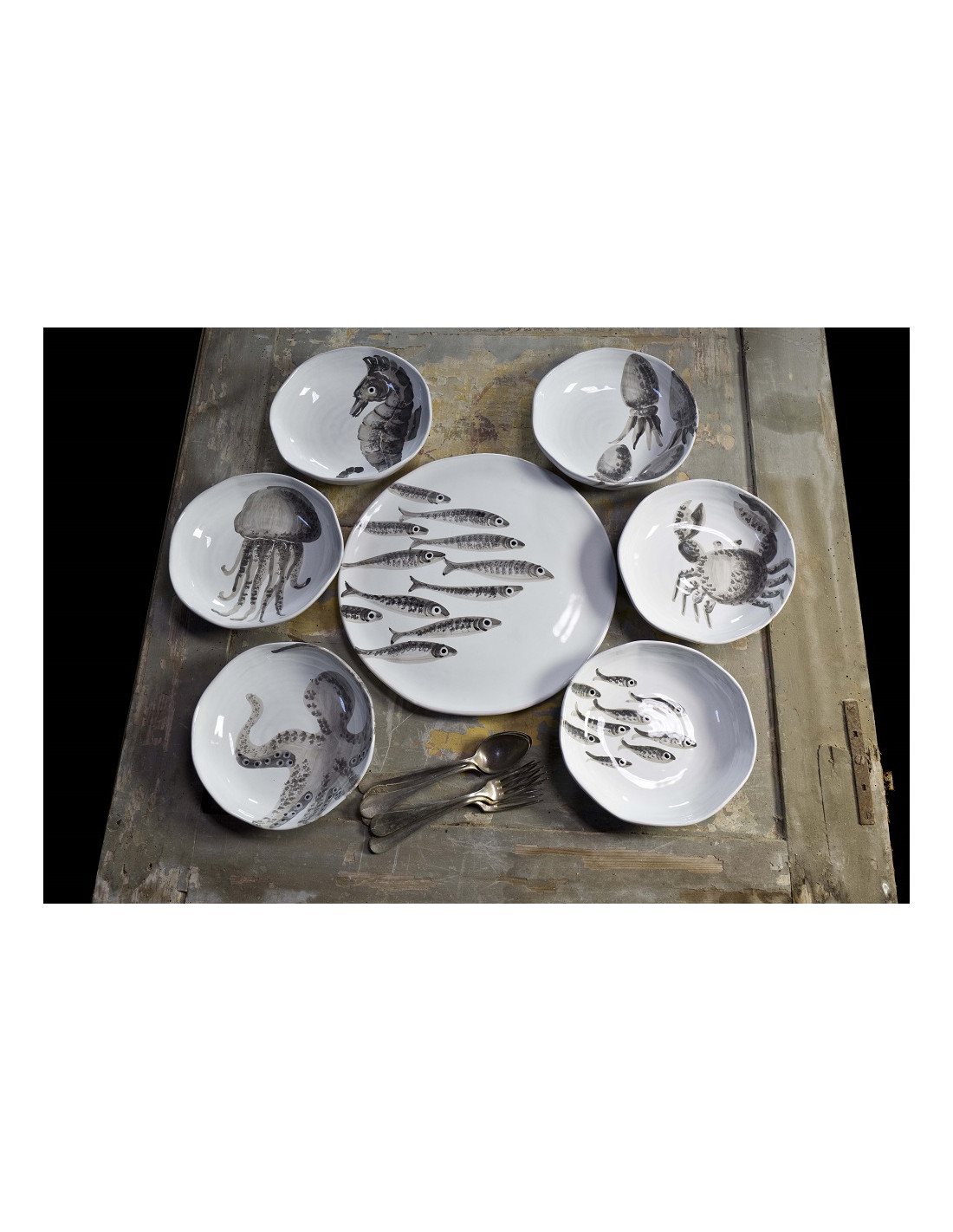 La serie decorata a mano con sardine, polpi, pesce spada.